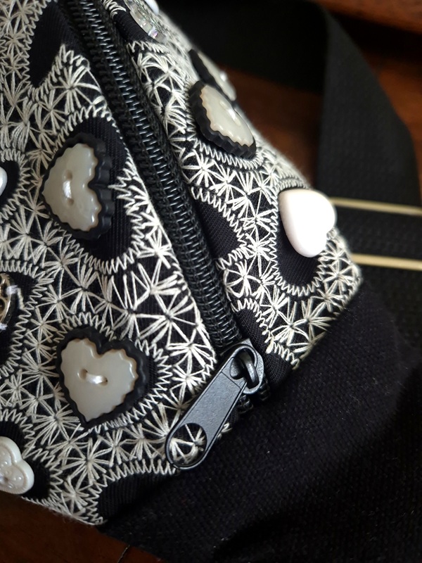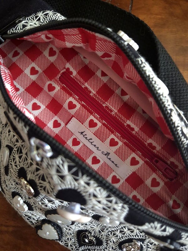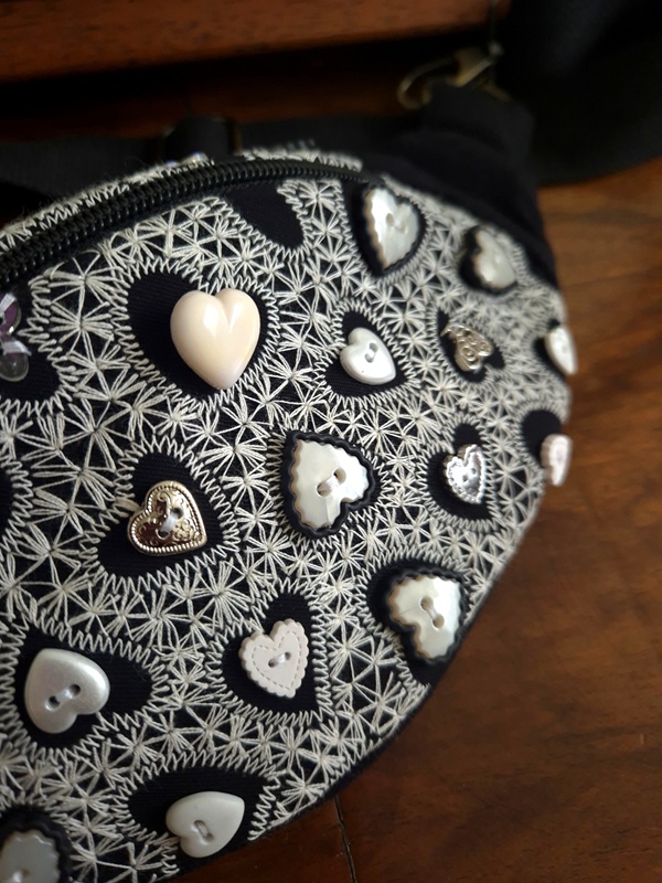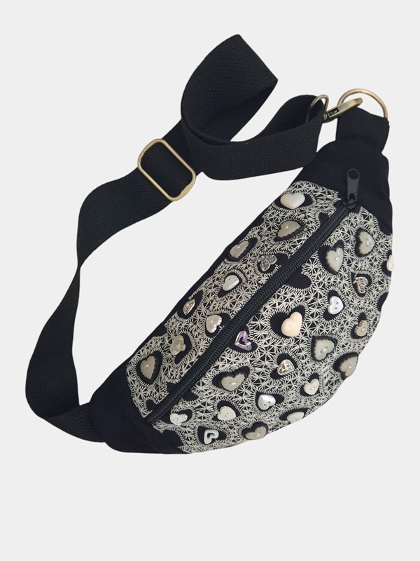 Een vrolijke en met de hand gemaakte festival fanny pack gemaakt van een tweedehands tafelkleed met een opvallende zwart-wit geborduurde hartjesprint. Wat de fanny pack helemaal uniek maakt zijn de vintage hartjes knopen die meteen in het oog springen.