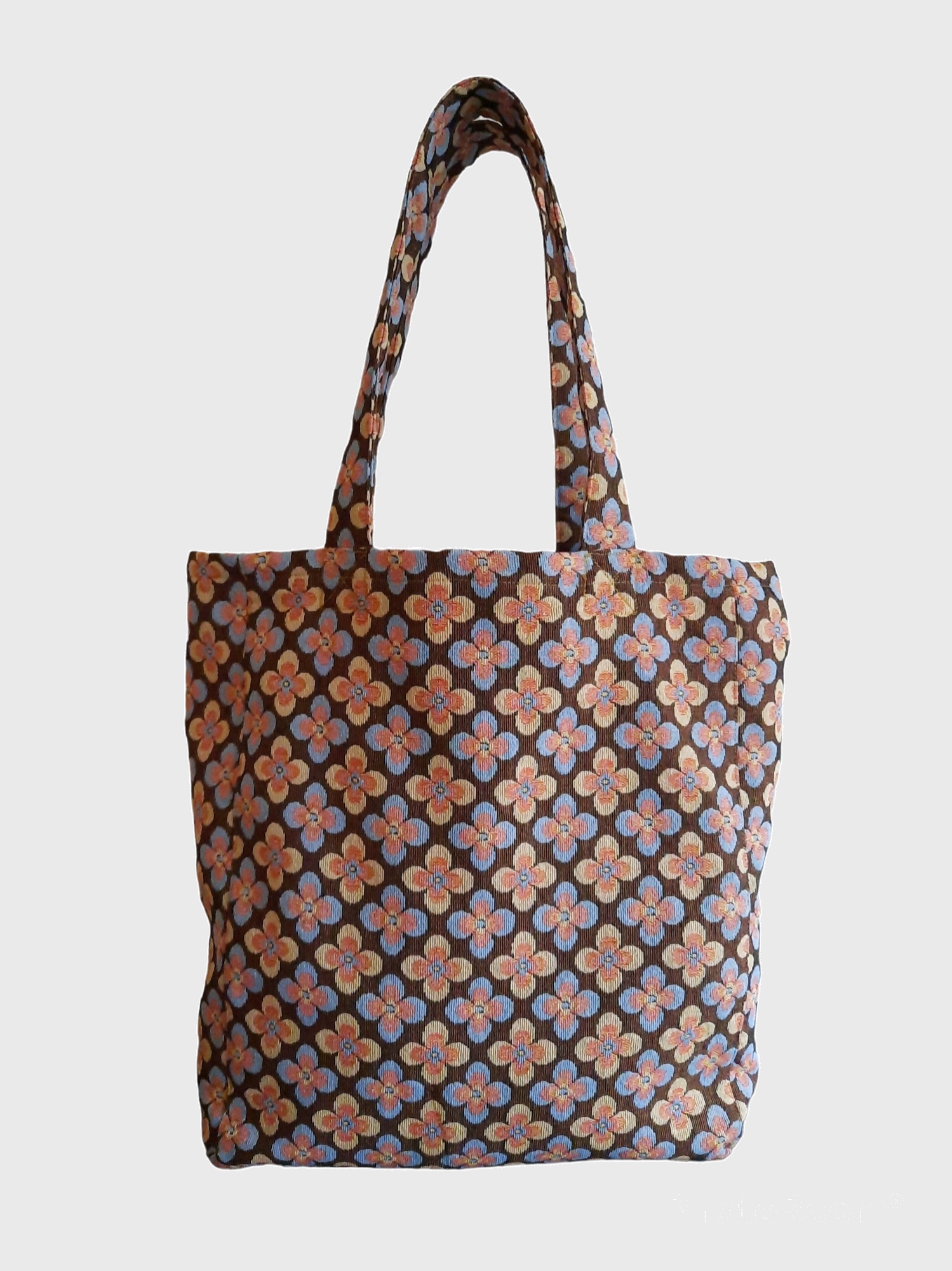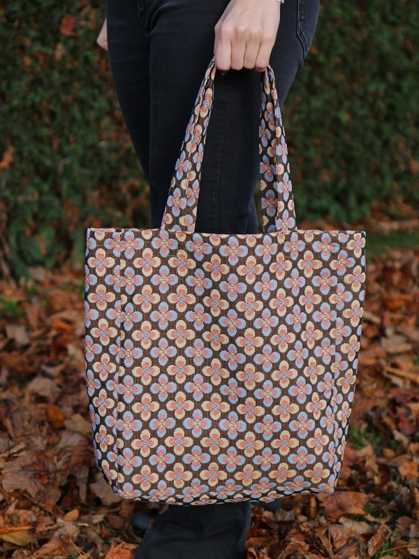 Kleur: bruine basis met pastelkleurige bloemen