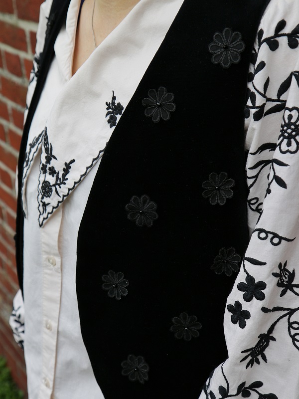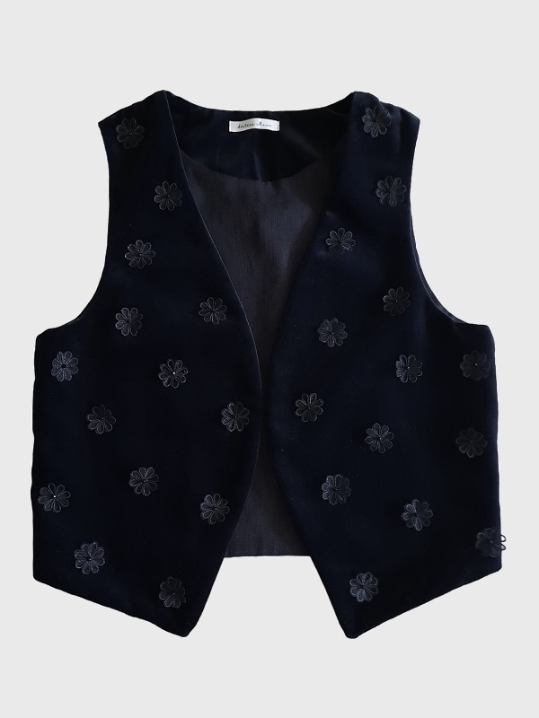 Met het Mave Gilet Black Flower heb je een echt uniek item. Het gilet van leftover zwart velvet is, zowel aan de voor- als achterkant, met de hand voorzien van zwarte bloemetjes en kraaltjes. De zwarte linnen voering maakt het giletje helemaal af.