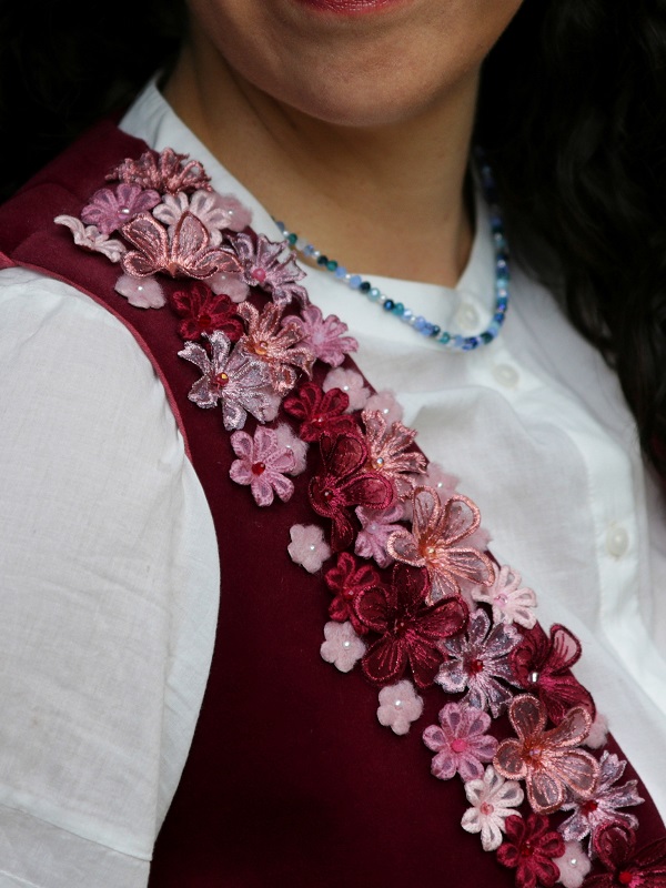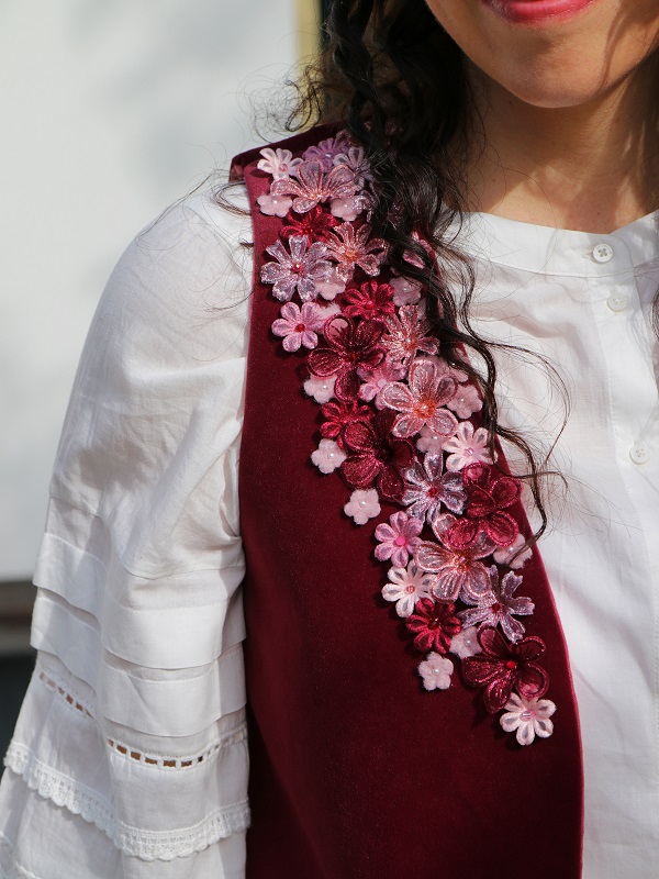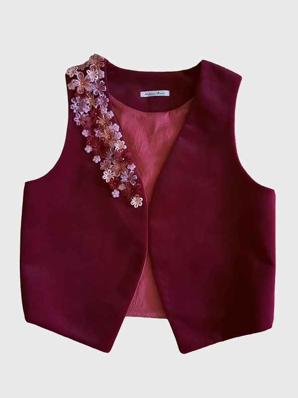 Met het Mave Gilet Bordeaux geef je je outfit zonder moeite een flinke upgrade. Het gilet van leftover velvet in bordeaux is met de hand geappliqueerd en voorzien van kleine bloemetjes in verschillende rood en roze tinten. Het giletje is gevoerd met een oudroze katoenen tafelkleed en kan in vele lookjes gedragen worden.