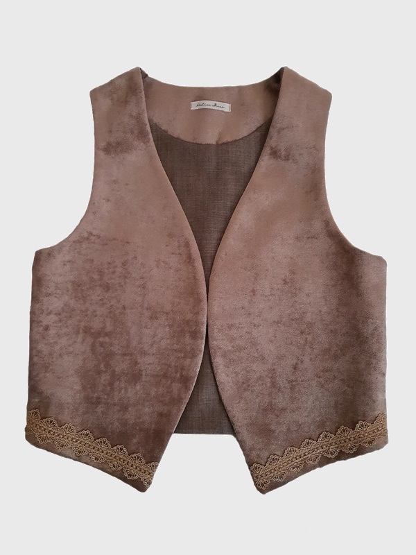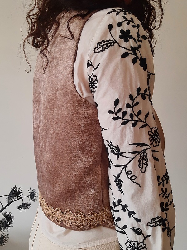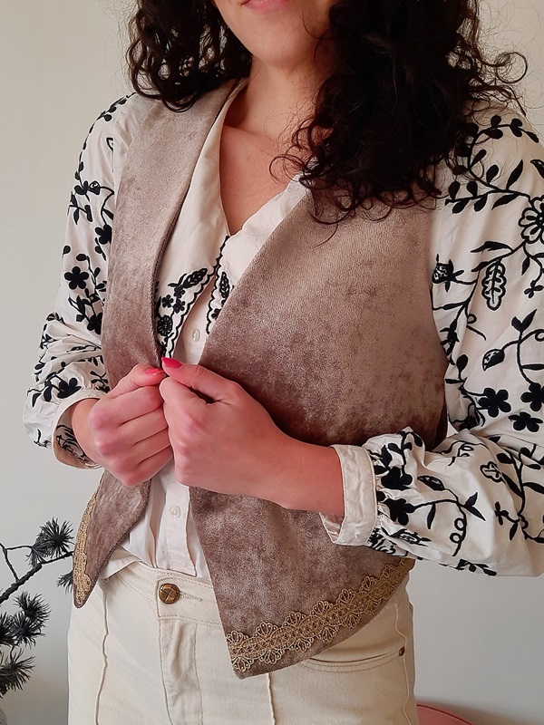 Met het Mave Gilet Champagne geef je je outfit zonder moeite een flinke upgrade. Het gilet van leftover velvet in champagnekleur is met de hand geappliqueerd en voorzien van een gouden biesje wat het giletje een feestelijke uitstraling geeft. Het giletje is gevoerd met een bruine leftover silk stof en kan in vele lookjes gedragen worden.