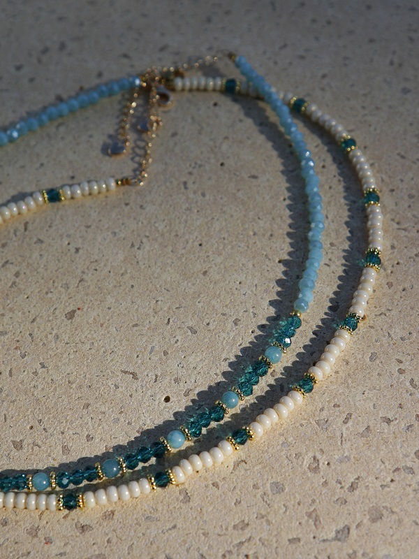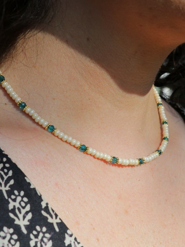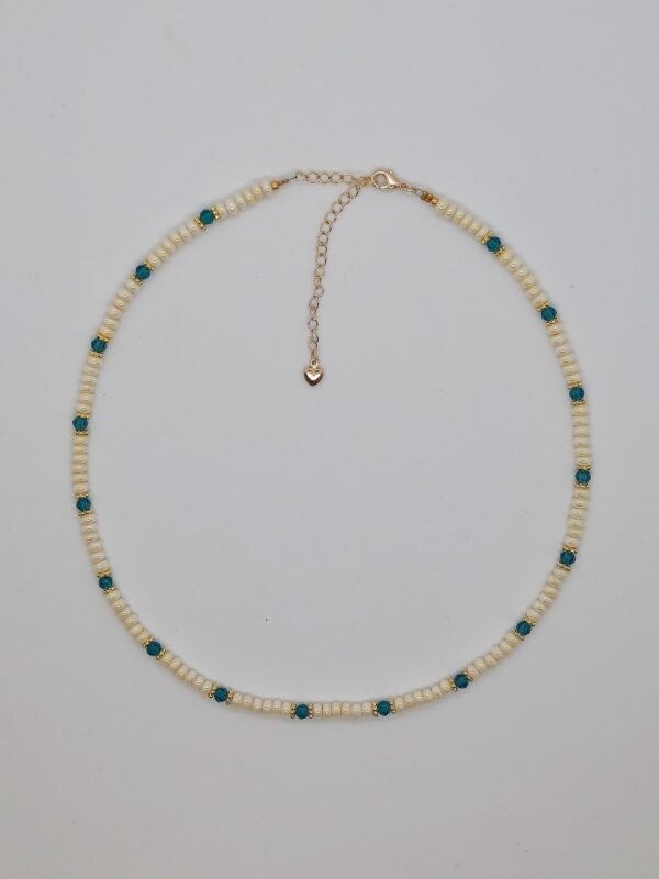 De Mave Necklace Cream is een frisse eye-catcher van je outfit. De crèmekleurige ketting met petrol en gouden details is geregen met rocailles kralen. Door het verlengstuk aan het 24K gold plated slotje kun je de ketting naar wens op lengte hangen.