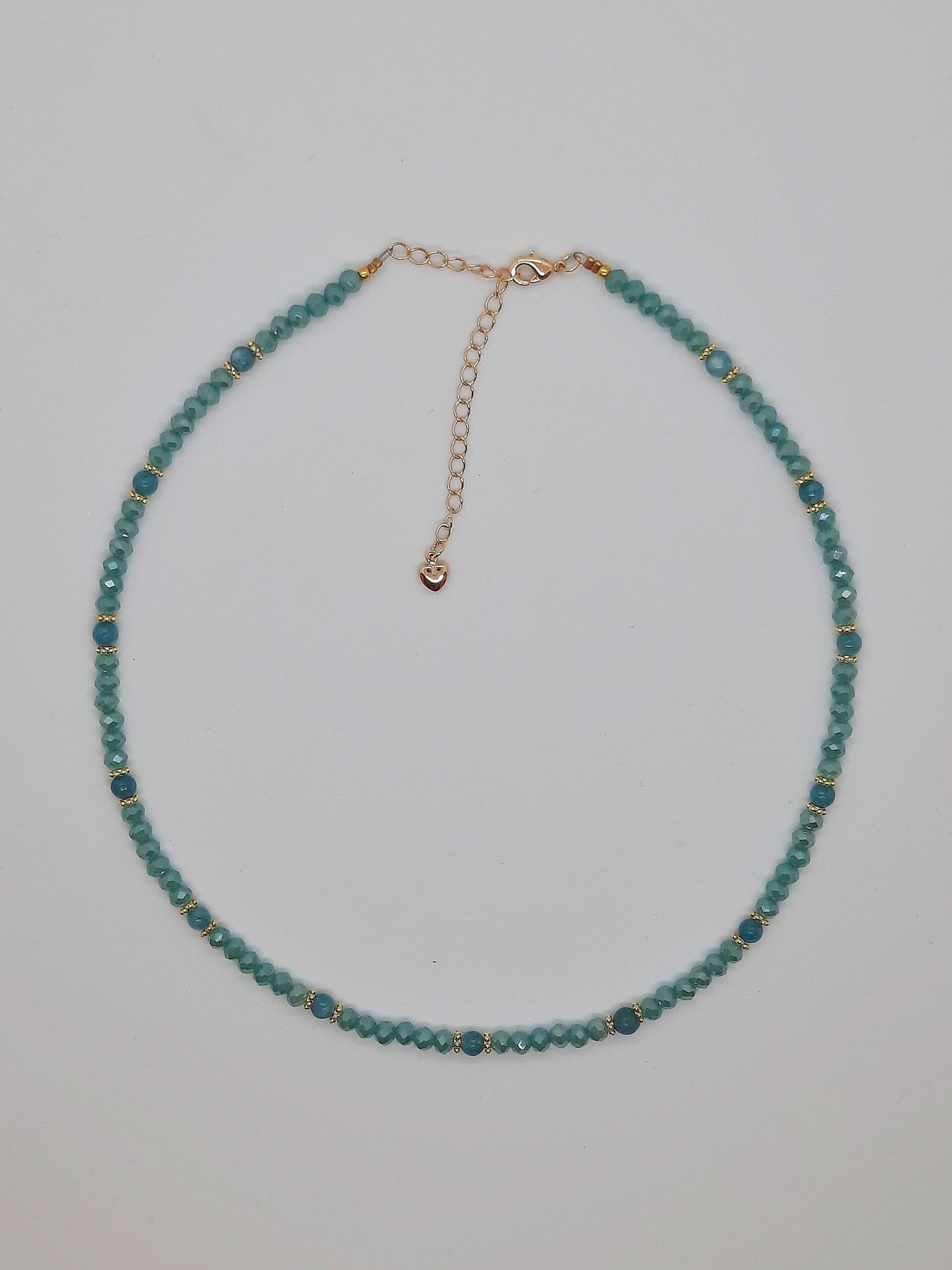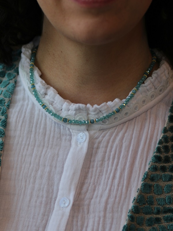 De Mave Necklace Emerald is een feestje om je hals. De kleurrijke ketting is geregen met kristal glazen rondelle kralen in combinatie met natuursteen Chalcedoon. Door het verlengstuk aan het 24K gold plated slotje kun je de ketting naar wens op lengte hangen.