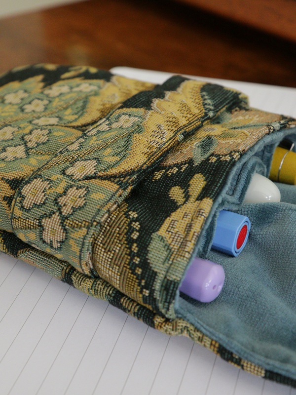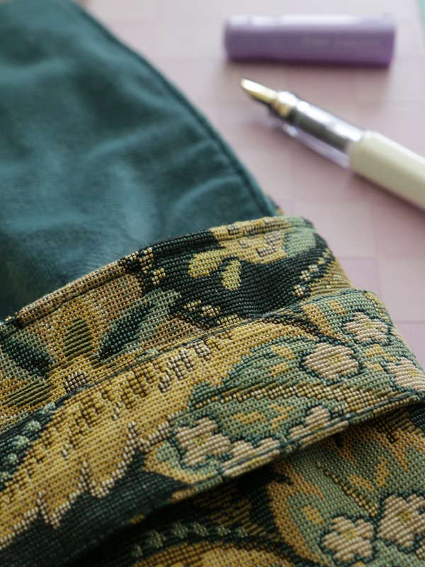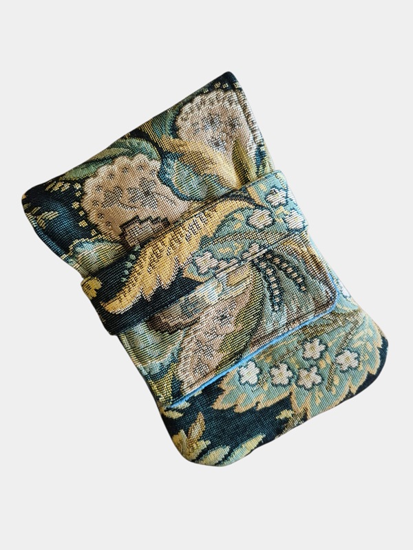 De buitenkant van deze penetui is gemaakt van een vintage tafelkleed met een botanisch geïnspireerd patroon. De groene jacquard stof heeft een klassieke uitstraling en een stevige structuur, waardoor de etui zowel stijlvol als robuust aanvoelt. De binnenzijde is gevoerd met zacht petrol velvet dat jouw vulpennen beschermt tegen krassen en slijtage. De lichte vulling zorgt ervoor dat je pennen veilig opgeborgen zijn, zonder dat de etui zwaar aanvoelt.