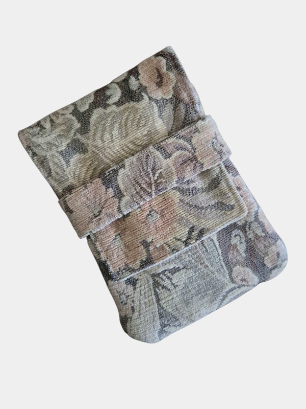 Voor de buitenkant is gebruikgemaakt van een tweedehands velvet gordijn in een rustige ecru tint. De stof heeft een rijke, zachte structuur en voelt luxe aan. De binnenzijde is gevoerd met crèmekleurig tweedehands velvet, wat zorgt voor een beschermende en elegante afwerking.